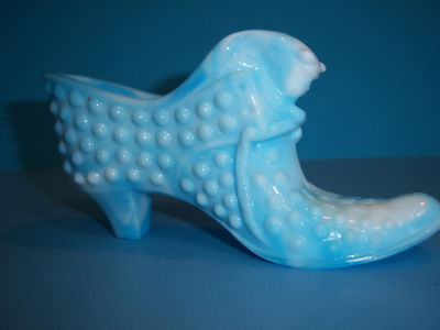 Title (ebay affiliate link): Vintage Fenton Blue Marble Hobnail Milk Glass Slipper Shoe Cat / Kitten Head