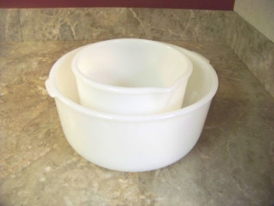 Title (ebay affiliate link): 2 Vintage Glasbake Sunbeam Mixmaster Mixer Mixing Bowls White Milkglass Glass