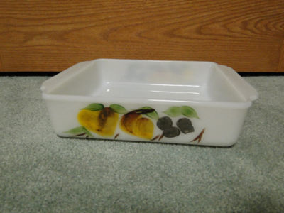 Title (ebay affiliate link): Vintage Fire King Gay Fad Fruits Square Milk Glass Baking Pan 8 1/2"