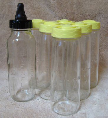 Title (ebay affiliate link): Lot 7 Vtg 8oz Glass Baby Bottles 6 Hygeia Ball w/ring & lids & 1 Evenflo USA