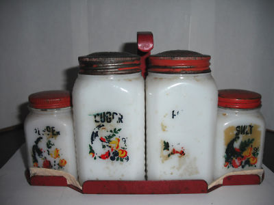 VINTAGE SPICE RACK WITH HANDLE AND 4 MILK GLASS JARS