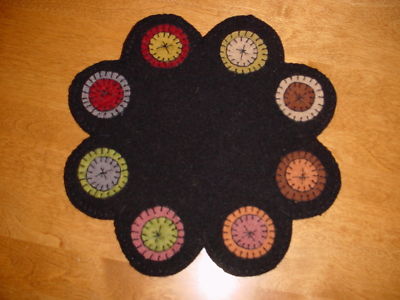 Title (ebay affiliate link): ~*~ Prim Folk Art Black Wool Scrappy Penny Rug Candle Mat ~ C&PLG ~*~