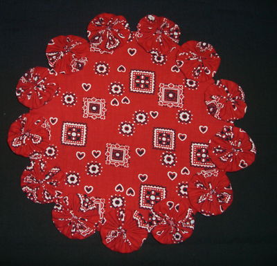 Title (ebay affiliate link): Primitive Red Hearts Valentine Fabric Yo Yo Candle Mat Doily Centerpiece