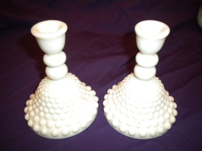 VINTAGE MILK GLASS HOBNAIL CANDLE HOLDERS 4 3/4"