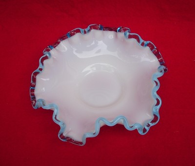Fenton Blue Crest Milk Glass Ruffled Candy Dish