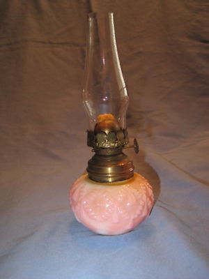 Miniature Oil Lamp, Pink milk glass, embossed cable