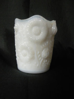 Title (ebay affiliate link): Vintage Milk Glass Toothpick Holder Raised Sunflowers Scalloped Rim 2 1/2" Tall