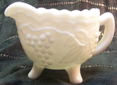 VINTAGE MILK GLASS CREAMER WITH GRAPE DESIGN AND 3 LEGS