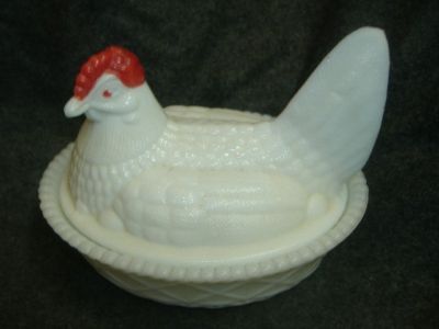 Title (ebay affiliate link): WHITE MILK GLASS HEN COVERED DISH EGG NEST TRINKET BOX CANDY Vintage Chicken