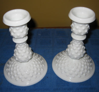 Pair Fenton Milk Glass Hob Nail Candle Sticks.Marked 6"