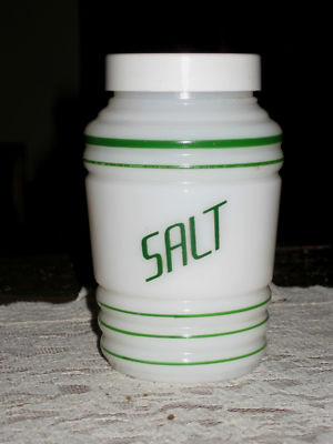 VINTAGE DEPRESSION ERA GREEN AND WHITE RIBBED MILK GLASS RANGE SALT JAR