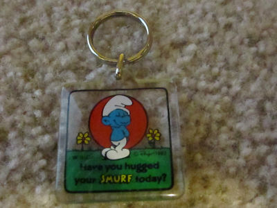 Title (ebay affiliate link): Smurf VINTAGE keychain collectible 1982 "Have you hugged your Smurf today?" EUC