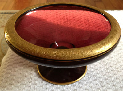 Gorgeous Amethyst Purple Glass Compote with Intricate Gold Trim