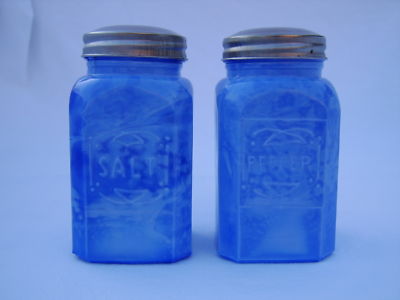 Title (ebay affiliate link): Square Blue Mottled Milk Glass Salt & Pepper Shaker Vintage Depression Style