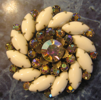 Title (ebay affiliate link): Lovely VTG Pin Brooch-Milk Glass& Aurora Borealis-Pinwheel design-MINT