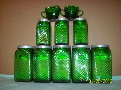 Title (ebay affiliate link): 1930's~OWENS ILLINOIS~10 pc. DEPRESSION GLASS CANISTER SET~SPICE JARS~excellent~