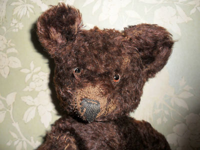Title (ebay affiliate link): RARE CHOCOLATE BROWN CURLY MOHAIR CHAD VALLEY "GRUNTER" TEDDY BEAR c1915