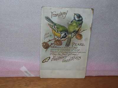Title (ebay affiliate link): FRED LOUNSBURY "FEBRUARY BIRTHDAY-BLUE TILMOUSE BIRDS & PEARL BIRTHSTONE" LOOK!!