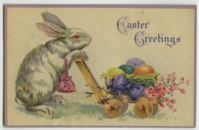 Title (ebay affiliate link): Vintage 1924 Easter Greetings Postcard Rabbit Pushing Cart of Eggs in Nest