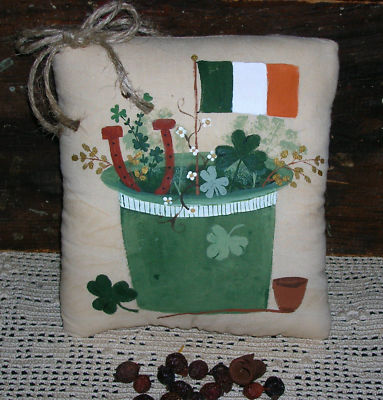 Title (ebay affiliate link): Primitive ST PATRICKS DAY Accent Pillow LEPRECHAUN HAT Gathering Handpainted