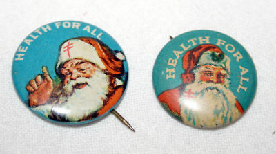 Title (ebay affiliate link): Two Celluloid Santa Pins. Both Tuberculosis Santa Pins