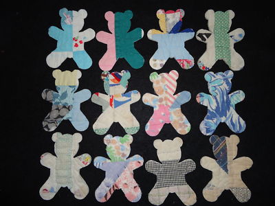 Title (ebay affiliate link): 12 PRIMITIVE ANTIQUE FOLK ART CUTTER QUILT CHRISTMAS TEDDY BEARS