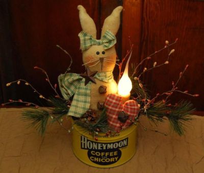 Title (ebay affiliate link): ****PRIMITIVE HANDMADE EASTER BUNNY RABBIT VINTAGE COFFEE CAN CANDLE LAMP****