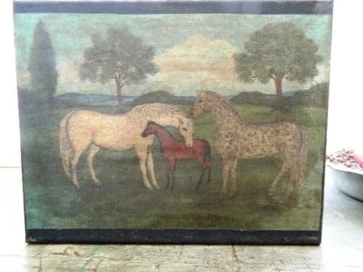 Title (ebay affiliate link): Primitive Portrait on Canvas of Three Horses in a Pasture