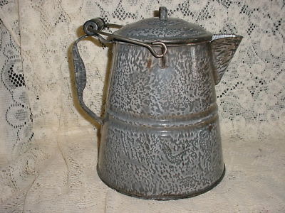Title (ebay affiliate link): gray/grey GRANITEWARE COFFEE POT with WOODEN HANDLE - very good condition, solid