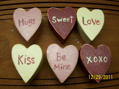 Title (ebay affiliate link): 6 Primitive Mini Valentine Hearts Bowl Ornies shelf sitters signs Reversable