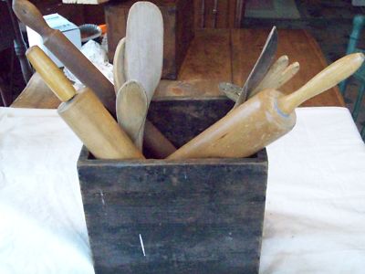 Title (ebay affiliate link): OLD BARN BLACK PAINT BOX FILLED WITH WOODEN SPOONS AND ROLLING PINS !