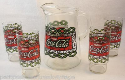 Title (ebay affiliate link): Vintage COKE Coca-Cola Stained Glass Soda Pitcher & Coke Logo Glasses 5PC Set