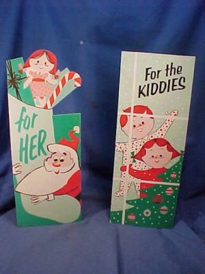 Title (ebay affiliate link): 2-1960s CHRISTMAS Store DISPLAY Stand Up SIGN-FOR KIDDIES + FOR HER