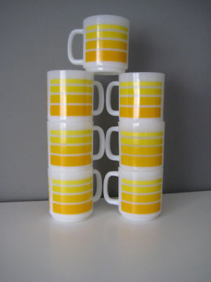 Title (ebay affiliate link): 7 Vintage Glaskbake Fire King Pyrex Coffee Mugs Milk Glass Yellow Orange Stripes