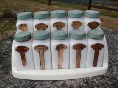 Title (ebay affiliate link): Griffiths Spice Jars Milk Glass Green Lids White Plastic Rack Set of 10 w/Labels