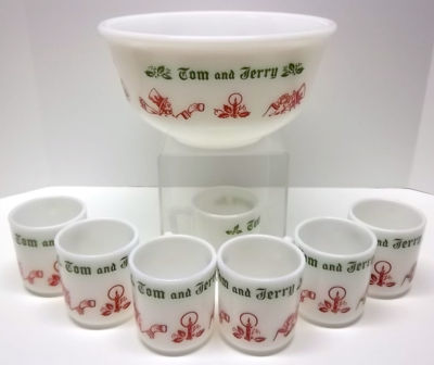 Title (ebay affiliate link): 8pc Vintage Hazel Atlas Tom & Jerry "Auld Lang Syne" White Milk Glass Eggnog Set