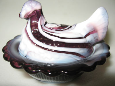 Title (ebay affiliate link): Amethyst and milk slag glass salt cellar hen chicken on nest basket dish purple