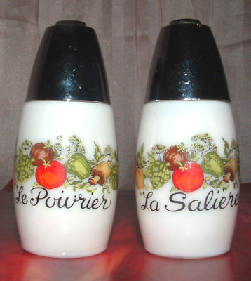 Title (ebay affiliate link): Retro Westmoreland Milk Glass Salt & Pepper Shakers French Script Veggie Motif