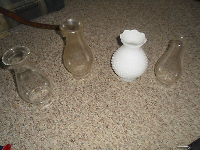 Title (ebay affiliate link): Vintage Oil Lamp Chimneys - 3 Crystal + 1 Hobnail Milk Glass