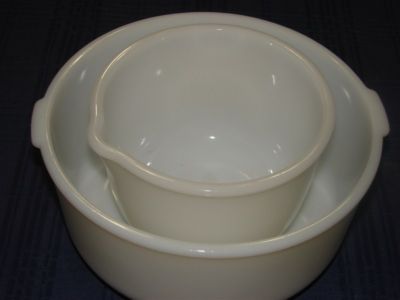 Glasbake Sunbeam Mixmaster Milk Glass Mixing Bowls Vintage 1950's (2) EUC 19CJ