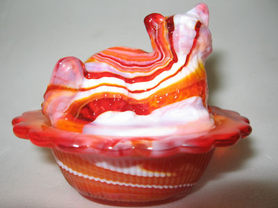 Ruby Red & milk slag glass salt cellar celt cat kitten kitty on nest basket dish
