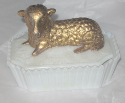 Westmoreland Gold Lamb on Nest box vintage milk glass