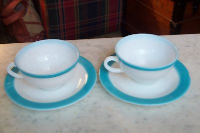 2 vintage Pyrex Turquoise Edge Cups and saucers 1960s Estate milk glass USA