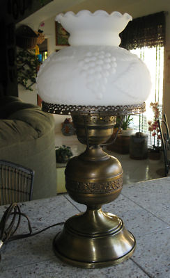 Title (ebay affiliate link): 17" Vintage Frosted Grape Milk Glass Heavy Brass Electric Student Lamp