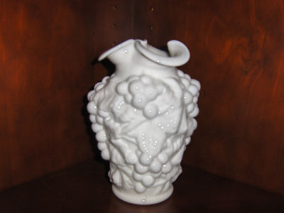 Title (ebay affiliate link): IMPERIAL GLASS EARLY 1950'S GRAPE AND LEAF MILK GLASS VASE WITH CLOVER OPENING