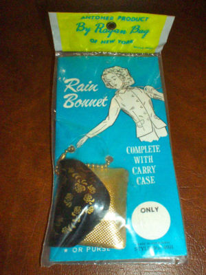 Title (ebay affiliate link): Vintage Rain Bonnet Keychain Black Gold Vinyl Tiny Clutch Purse Keychain NOS MIP