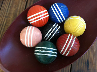 Title (ebay affiliate link): 7 Vintage Primitive Wooden Ribbed Striped Croquet Balls- Bowl Fillers
