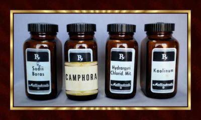 Title (ebay affiliate link): LOT of 4 AMBER GLASS SQUARE APOTHECARY BOTTLES JARS MALLINCKRODT BAKELITE LIDS