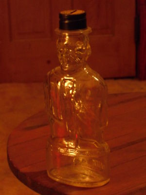 VINTAGE 8 1/2" GLASS LINCOLN BANK BOTTLE WITH ORIGINAL LINCOLN CAP-LAWRENCE,MASS