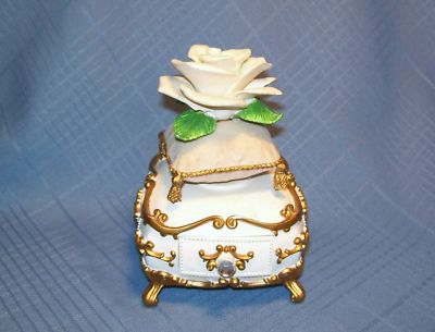 Revolving capodimonte rose on a pillow jewelled vtg musical jewelry box